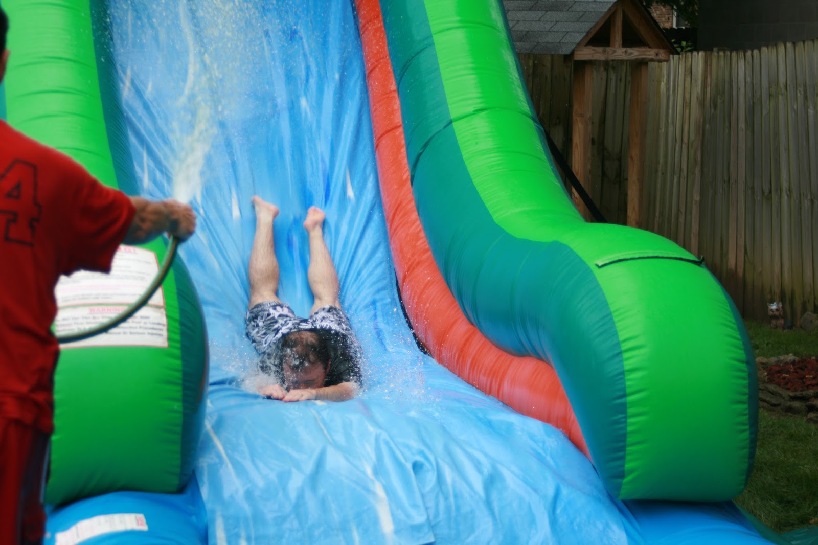 My Uncle & Aunt host the picnic and they go all out - complete with a water slide! (That's Brandon going down head-first - what a dare devil). ;)